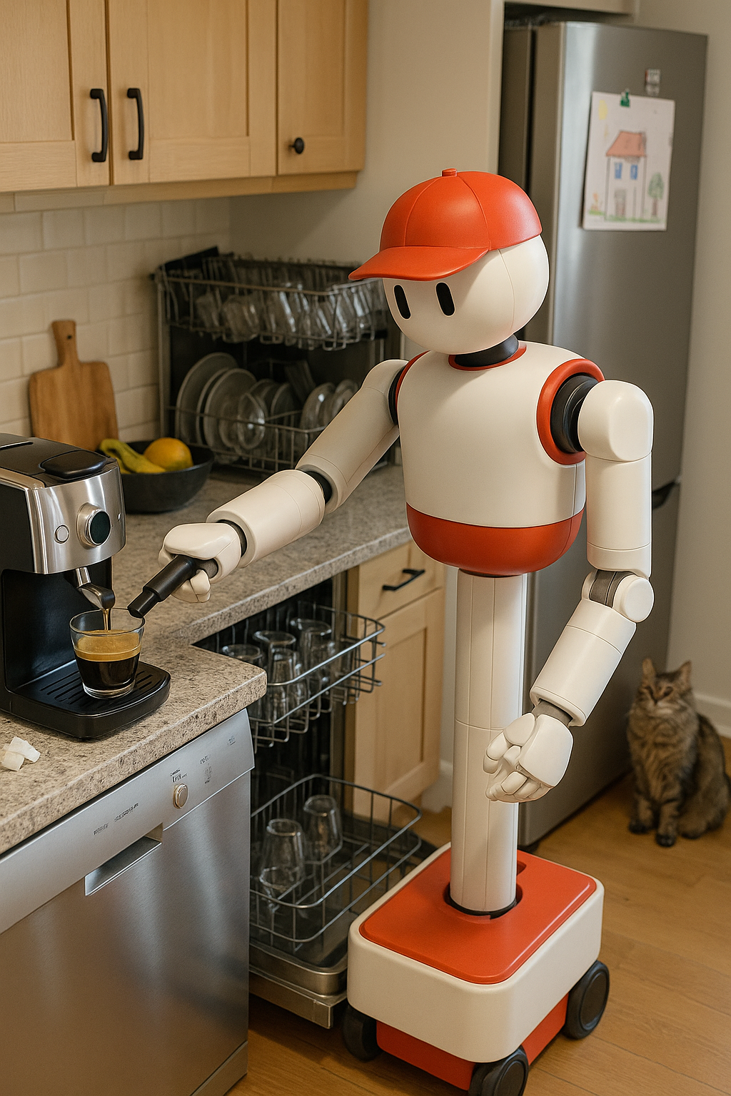 Memo oogt aandoenlijk: op een wagentje, met een centrale kolom die omhoog en omlaag glijdt, twee grijparm-achtige handen, een cartoonachtig gezicht en een rode honkbalpet. Geen humanoïde pop – maar juist een pragmatisch mechanisme dat in een echte keukenomgeving uit de voeten moet.
