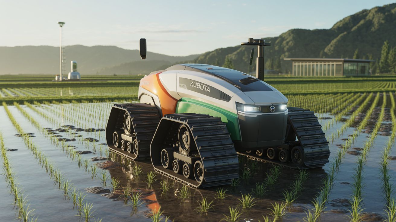Kubota vervangt wielen door vier zogeheten “Mattracks” — rupsbandachtige crawlers — die elk een eigen motor hebben. Daardoor kan het voertuig zich soepel manoeuvreren op rijstvelden of modderige akkers, met aanpasbare hoogte en een draaicirkel die zelfs op krappe percelen handig is.