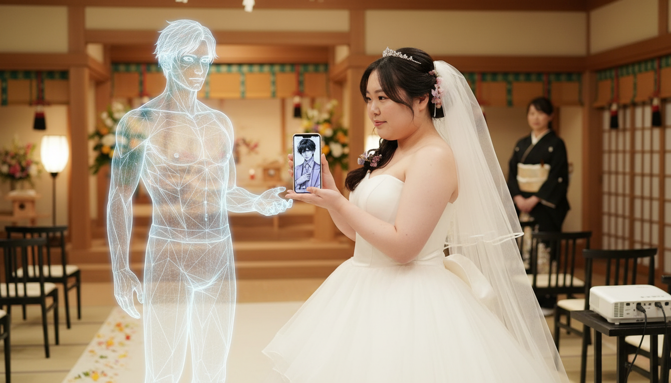 In een traditionele trouwzaal in West-Japan speelde muziek toen Yurina Noguchi, 32-jarige callcenter-medewerker, in een witte jurk en tiara haar eigen huwelijksceremonie beleefde — maar haar echtgenoot stond niet naast haar in vlees en bloed. De partner waar ze “ja” tegen zei, verscheen via een smartphone-scherm en augmented-reality-bril: een volledig door kunstmatige intelligentie gegenereerde persoonlijkheid, genaamd Lune Klaus Verdure.