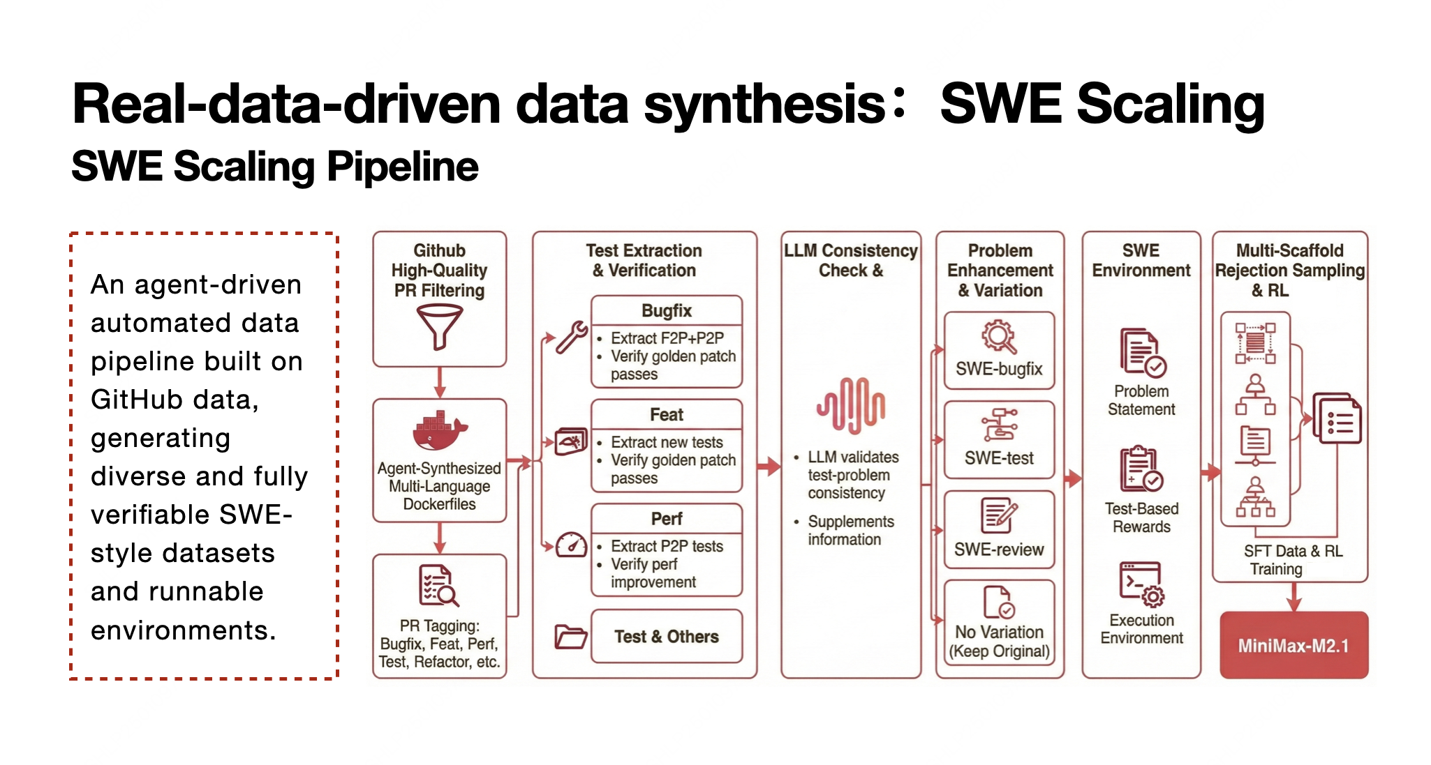 De post-trainingstrategie begint bij de bron: echte data uit GitHub. MiniMax werkt met duizenden Pull Requests (PR’s) en commits om representatieve code-taken te creëren. Elk PR-record wordt eerst gefilterd op kwaliteit en daarna in een bruikbare Docker-omgeving gebracht, een taak waar agenten zelf in worden getraind.