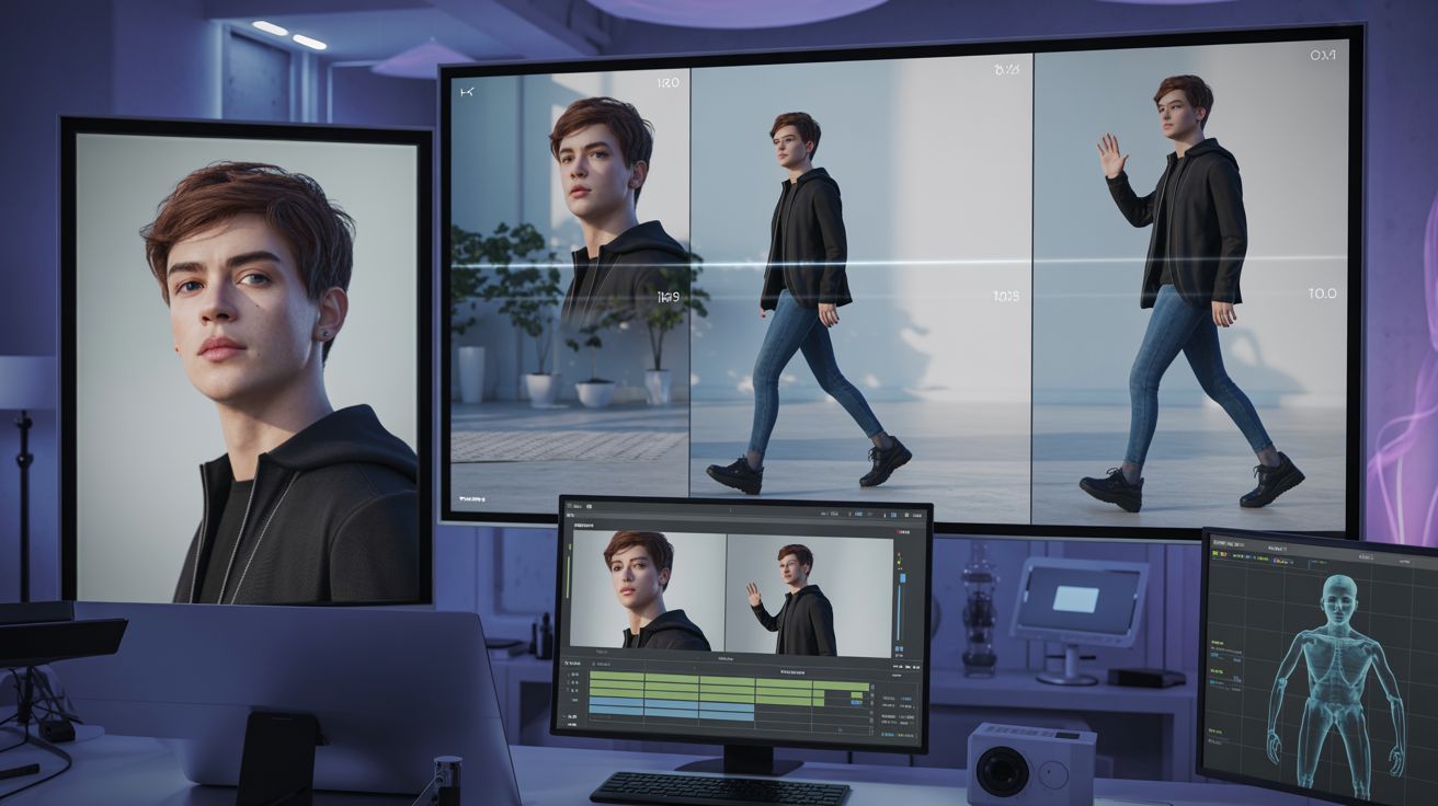 Vervolgens worden in dezelfde omgeving korte motion-reference-video’s gemaakt. Door simpele prompts — een stap vooruit, een draai, een handgebaar — ontstaat een referentieclip op basis van een mannequin of basisfiguur.